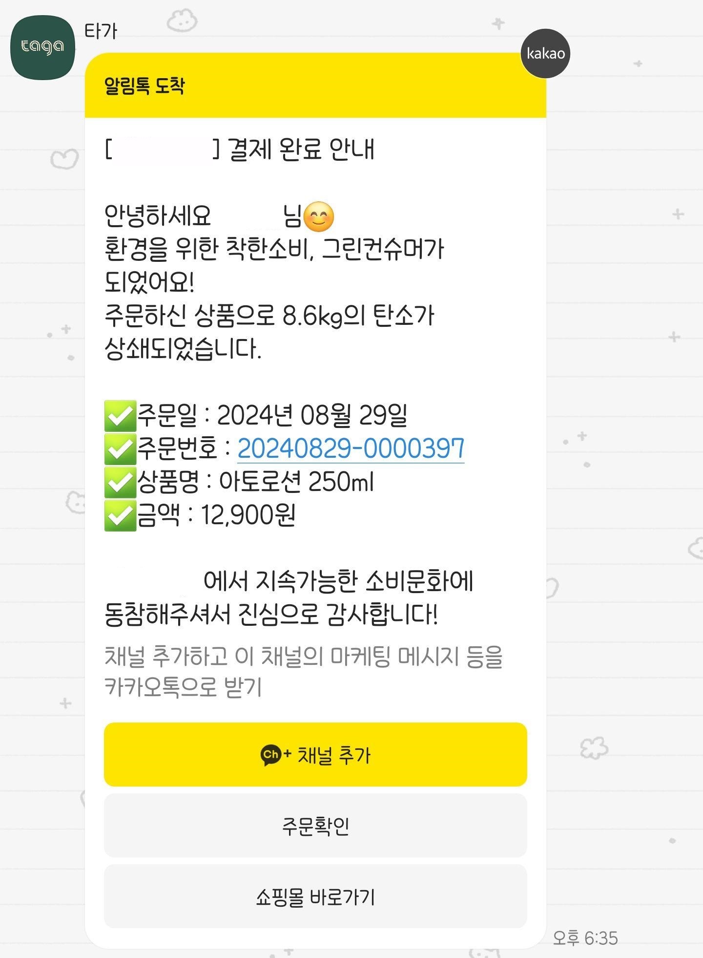 타가는 스테핑과 함께 알림톡을 통해 고객들에게 탄소상쇄 참여 경험을 손쉽게 전달했어요. 알림톡으로 탄소중립 프로젝트와 참여 결과를 투명하게 공유하며, 브랜드의 친환경 이미지를 한층 강화했답니다.