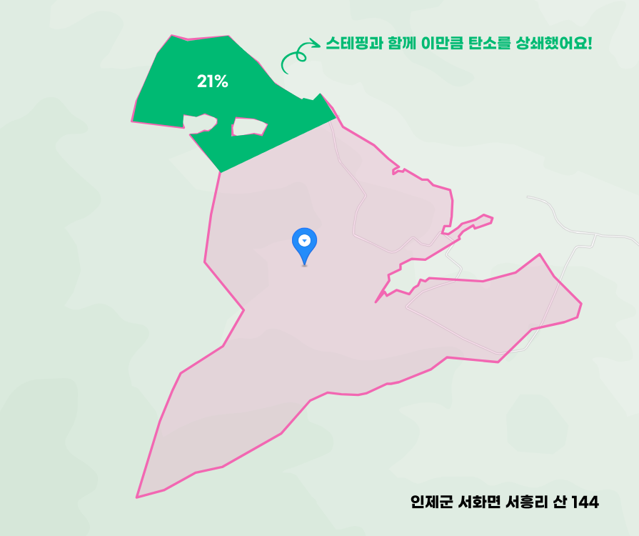 2024년은 인제군 숲(서화면 서흥리 산 144)에서 스테핑의 지속가능한 활동이 돋보였던 해였어요. 인제군 소유의 숲 총 탄소상쇄량은 3,909tCO₂이었는데요. 이 중 스테핑 총 구매량은 825tCO₂ 으로 전체 산림의 21% 탄소를 상쇄했어요.