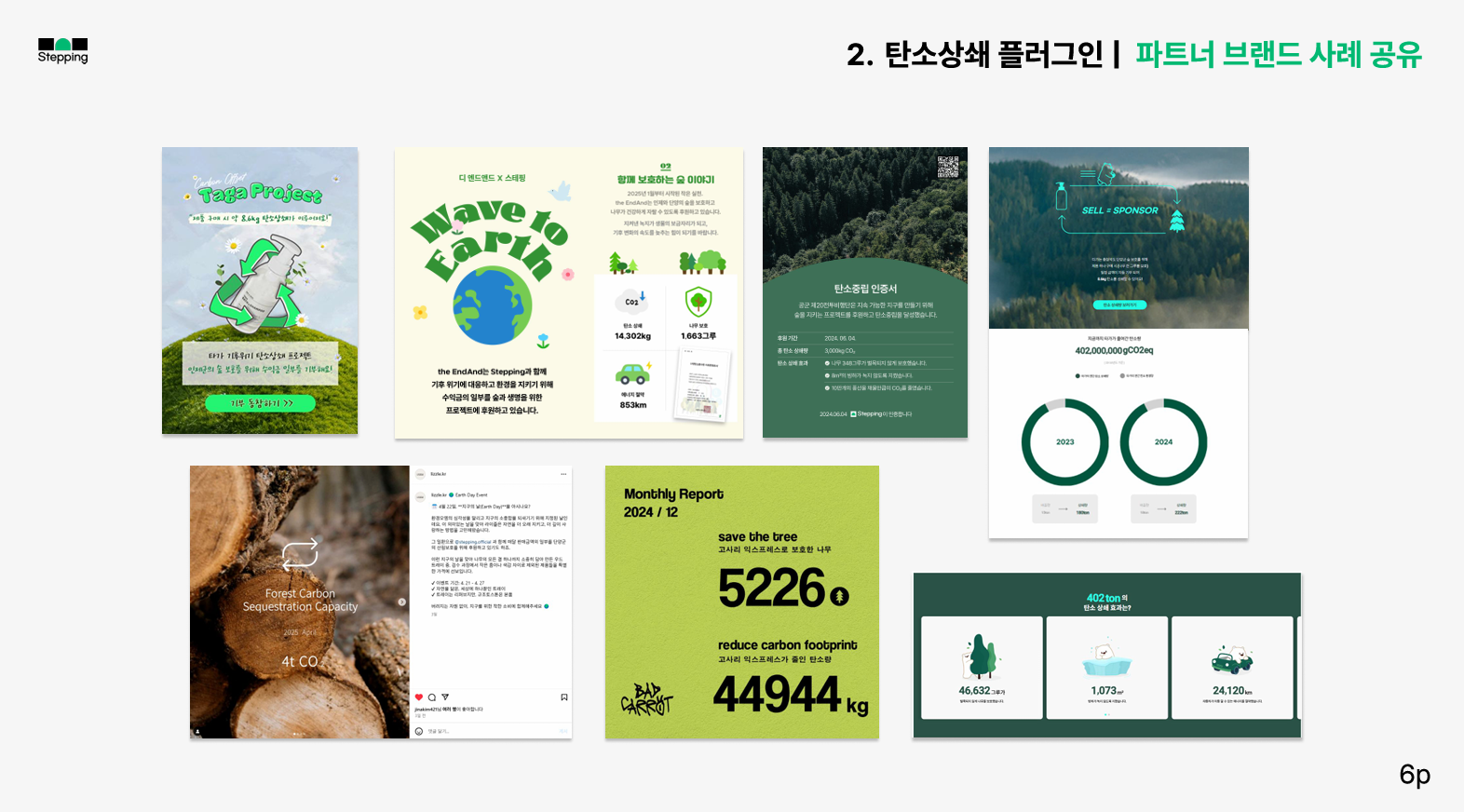 스테핑은 민간 대표 플랫폼으로서 🌿 탄소상쇄 플러그인 🌿 탄소중립 행사 지원 서비스 🌿 산림 프로젝트 기반의 탄소상쇄 거래 경험과 과제를 공유하며, 보다 쉽게 접근할 수 있는 탄소상쇄 솔루션과 브랜드 연계 사례들을 소개했습니다. |