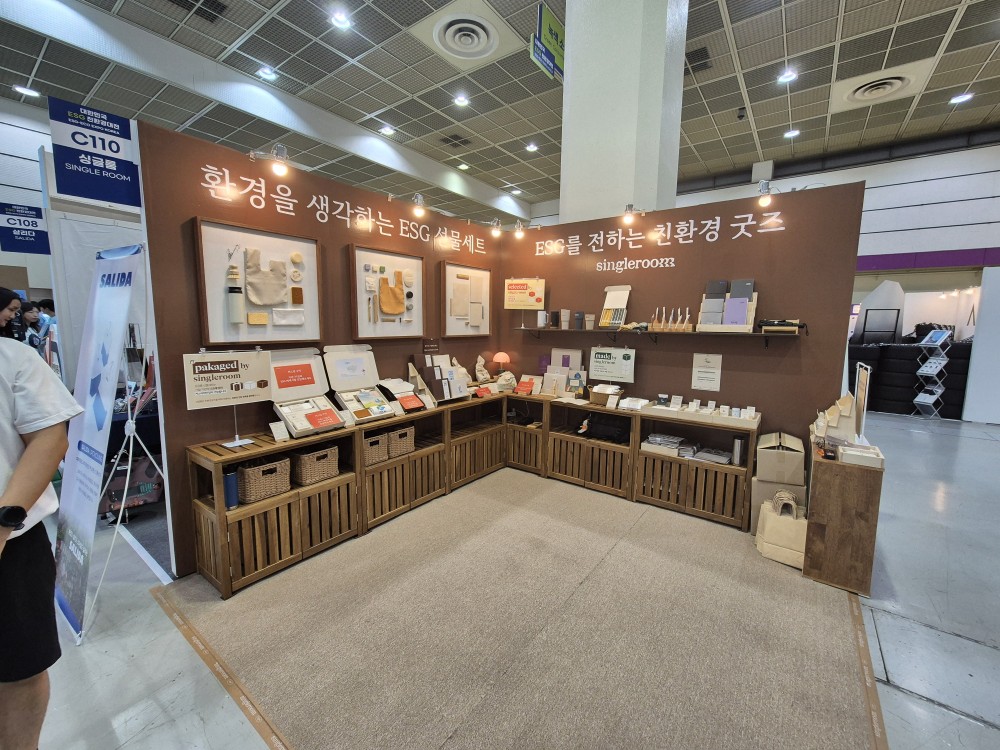 늘 감각적인 부스를 선보이는 싱글룸은 다양한 친환경 굿즈를 깔끔하면서도 세련되게 구성해 많은 관람객들의 눈길을 끌었어요. 스테핑팀이 늘 애정하는 언롤서피스의 CXP 소재 컵도 부스에서 만나볼 수 있어 반가웠고요 ☕